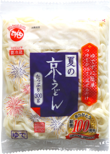 | 弊社オリジナルブレンドの小麦粉を使用した人気商品の「京うどん」を夏仕様に改良し、しなやかでのど越しがよく、茹でずに冷たいつゆをかけるだけでお召し上がりいただける、たっぷり300g入った“創業100周年記念商品”にて新登場! |