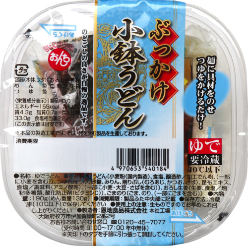 | つるつるっと口当たりのよい細うどんに、自家製冷しめんつゆ・おろし生姜・風味のよいごまのりをかけるだけ。簡単・便利にお召し上がりいただける、ぶっかけタイプの冷しうどんです。 |