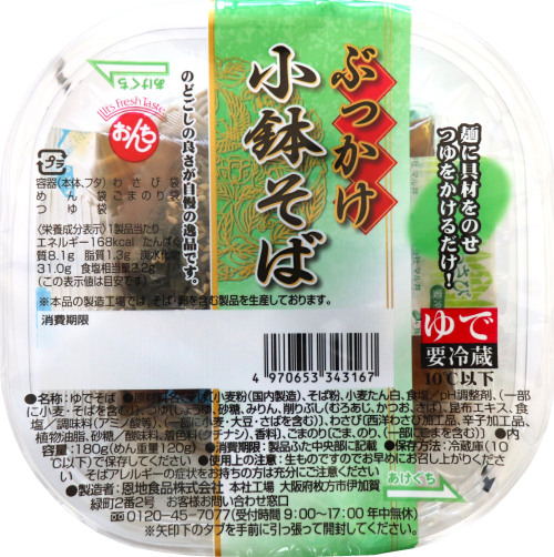 | しなやかでのど越しのよいそばに、自家製冷しめんつゆ・わさび・風味のよいごまのりをかけるだけ。簡単・便利にお召し上がりいただける、ぶっかけタイプの冷しそばです。 |